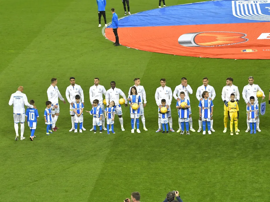 Fotbalistii craioveni la startul meciului de fotbal dintre Universitatea Craiova si FCSB, contand pentru Play-off-ul Superligii Superbet, desfasurat pe Stadionul Ion Oblemenco din Craiova, duminica 30 aprilie 2023. © FOTO:Razvan Pasarica/SPORT PICTURES