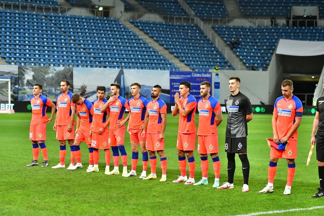 Fotbalistii stelisti la startul meciului in meciul de fotbal dintre U Craiova 1948 si FCSB, contand pentru Liga 1 Casa Pariurilor, desfasurat pe Stadionul Ion Oblemenco din Craiova, sambata 18 septembrie 2021. © FOTO:Remus Badea/SPORT PICTURES