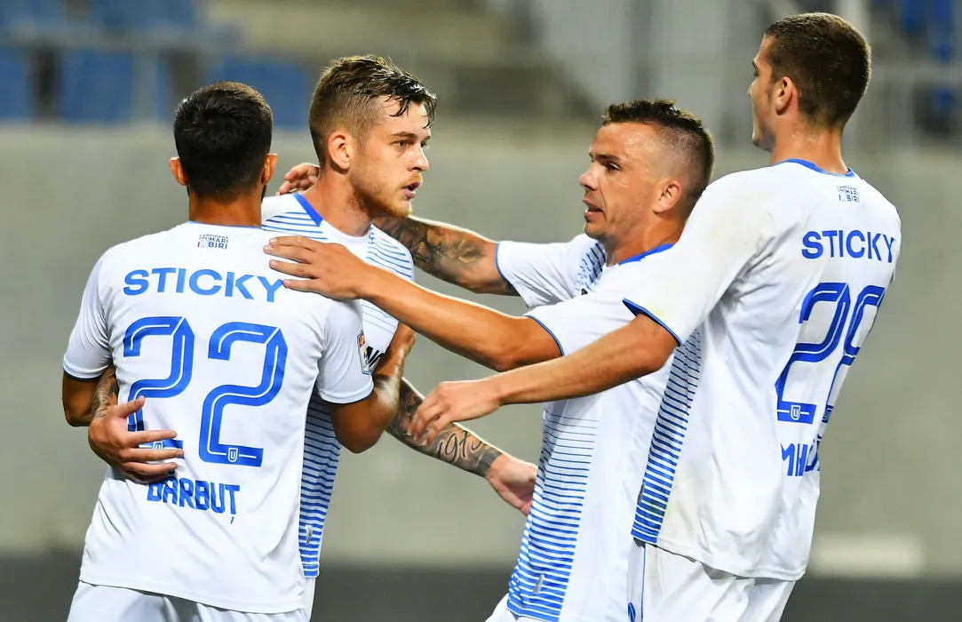 Bucurie craioveana cu Alexandru Cicaldau si Dan Nistor in meciul de fotbal dintre Universitatea Craiova si FCSB, contand pentru play-off-ul Ligii 1 Casa Pariurilor, disputat fara spectatori pe Stadionul Ion Oblemenco din Craiova, duminica 12 iulie 2020. © FOTO:Razvan Pasarica/SPORT PICTURES