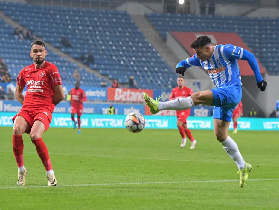 Diaz Luis Javier Paradela și Valerică Marius Găman în meciul de fotbal dintre Universitatea Craiova și AFC Hermannstadt Sibiu, contând pentru SuperLiga Superbet, desfășurat pe Stadionul Ion Oblemenco din Craiova, sâmbătă 9 noiembrie 2024. © FOTO: Remus BADEA/SPORT PICTURES