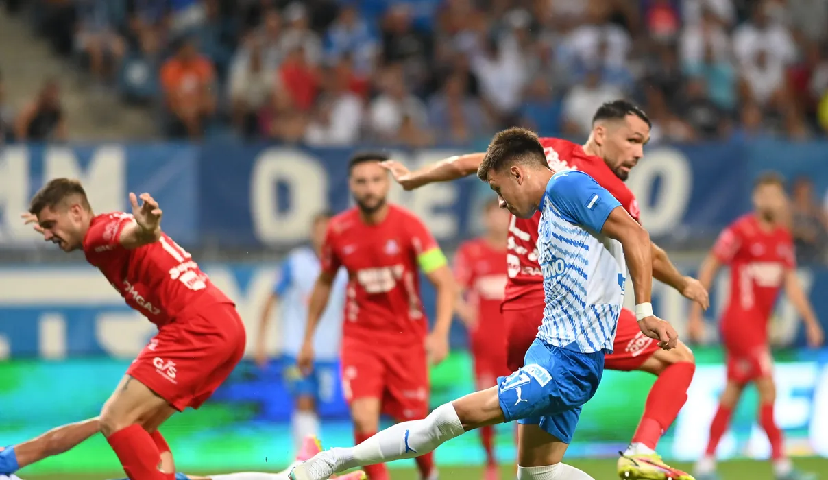 Marian Danciu si Valerica Marius Gaman in meciul de fotbal dintre Universitatea Craiova si FC Hermannstadt, contand pentru Superliga Superbet, desfasurat pe Stadionul Ion Oblemenco din Craiova, vineri 4 august 2023. © FOTO:Razvan Pasarica/SPORT PICTURES
