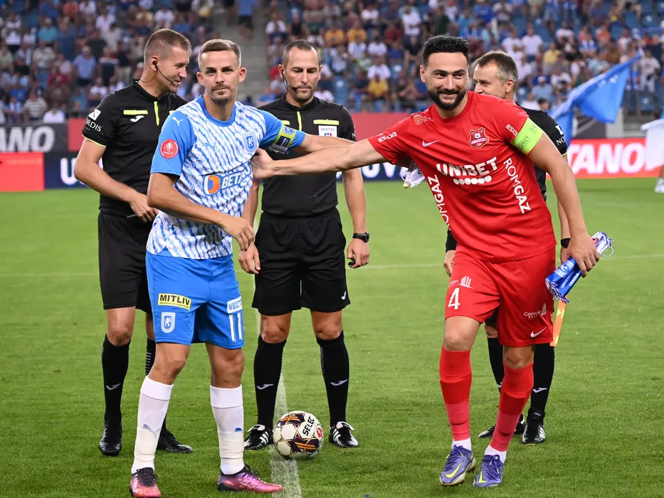 Brigada de arbitrii formata din Vasile Marinescu, Ionut Coza si Romica Birdes alaturi de capitanii Nicusor Silviu Bancu si Ionut Stoica in meciul de fotbal dintre Universitatea Craiova si FC Hermannstadt, contand pentru Superliga Superbet, desfasurat pe Stadionul Ion Oblemenco din Craiova, vineri 4 august 2023. © FOTO:Razvan Pasarica/SPORT PICTURES