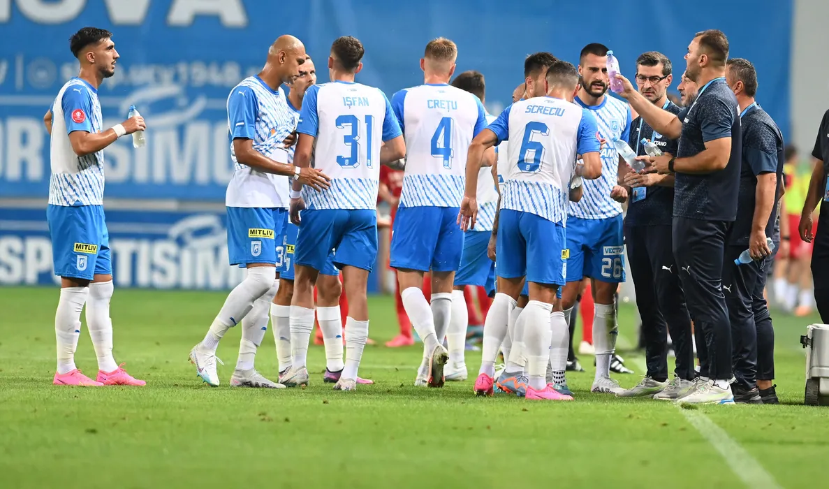 Fotbalistii craioveni Andrei Virgil Ivan, Raul Michel Melo Da Silva si Gjoko Zajkov la o pauza de hidratare luata la meciul de fotbal dintre Universitatea Craiova si FC Hermannstadt, contand pentru Superliga Superbet, desfasurat pe Stadionul Ion Oblemenco din Craiova, vineri 4 august 2023. © FOTO:Razvan Pasarica/SPORT PICTURES