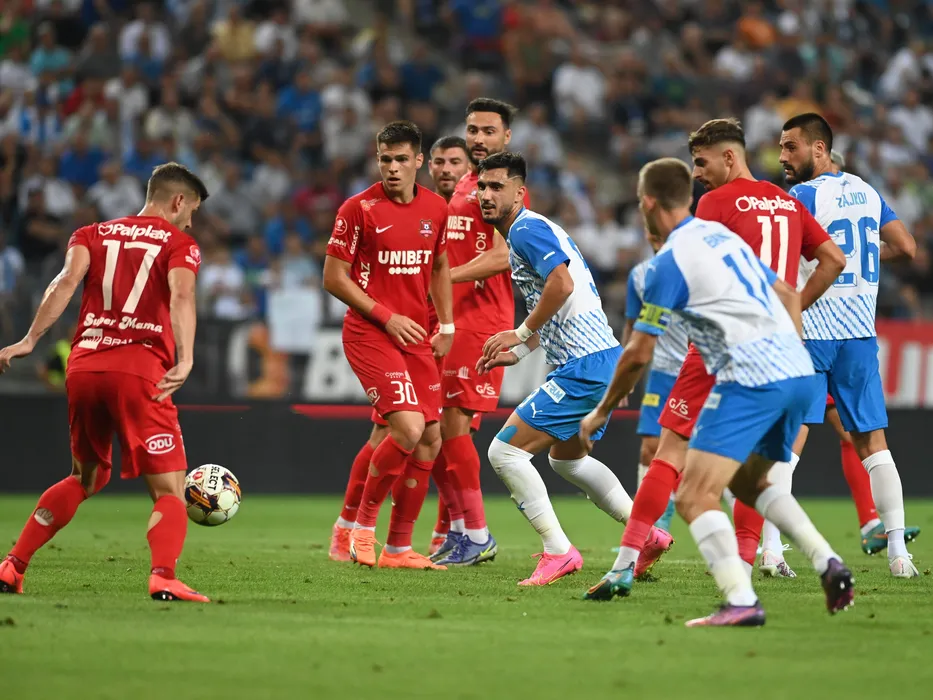 George Daniel Paraschiv, Ionut Stoica, Andrei Virgil Ivan, Petru Dragos Iancu si Gjoko Zajkov in meciul de fotbal dintre Universitatea Craiova si FC Hermannstadt, contand pentru Superliga Superbet, desfasurat pe Stadionul Ion Oblemenco din Craiova, vineri 4 august 2023. © FOTO:Razvan Pasarica/SPORT PICTURES