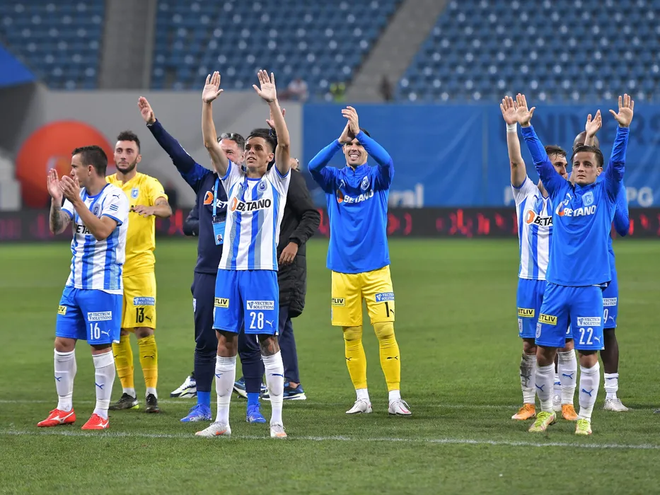 Fotbalistii craioveni Dan Nicolae Nistor, Alexandru George Cimpanu, David Beniamin Lazar si Gustavo Vagenin aplauda galeria dupa meciul de fotbal dintre Universitatea Craiova si Dinamo Bucuresti, contand pentru Liga 1 Casa Pariurilor, desfasurat pe Stadionul Ion Oblemenco din Craiova, luni 27 septembrie 2021. © FOTO:Razvan Pasarica/SPORT PICTURES