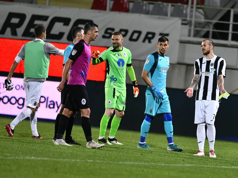 Ionut Justinian Larie, Razvan Nicolae Plesca, David Beniamin Lazar si Denis Alibec discuta dupa meciul de fotbal dintre Astra Giurgiu si Gaz Metan Medias, contand pentru play-off-ul Ligii 1 Casa Pariurilor, disputat fara spectatori pe Stadionul Marin Anastasovici din Giurgiu, luni 15 iunie 2020. © FOTO:Razvan Pasarica/SPORT PICTURES