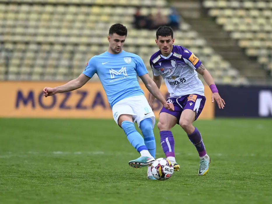 Vitalie Damascan si Costinel Andrei Tofan in meciul de fotbal dintre FC Arges si FC Voluntari, contand pentru Play-out-ul Superligii Superbet, desfasurat pe Stadionul Nicolae Dobrin din Pitesti, duminica 2 aprilie 2023. © FOTO:Razvan Pasarica/SPORT PICTURES