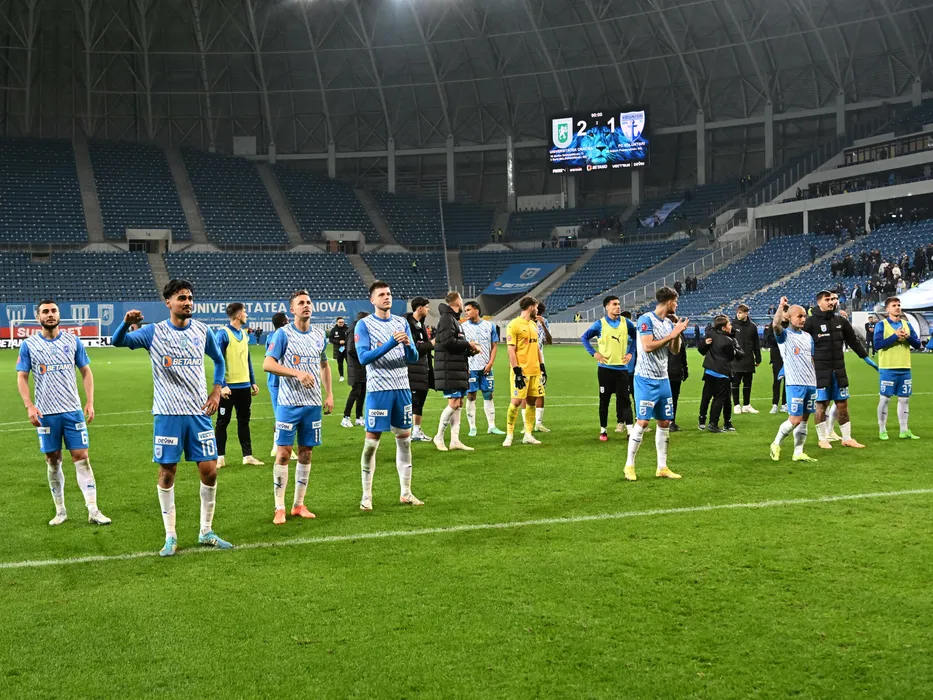 Fotbaliștii craioveni Screciu Vladimir Ionuț, Ștefan Baiaram, Nicușor Silviu Bancu, Juraj Badelj, Ionuț Alexandru Mitriță, Jovan Markovic si Marian Danciu salută galeria după meciul de fotbal dintre Universitatea Craiova si FC Voluntari, contând pentru Superliga Superbet, desfășurat pe Stadionul Ion Oblemenco din Craiova, luni 26 februarie 2024. © FOTO: Răzvan PĂSĂRICĂ/SPORT PICTURES