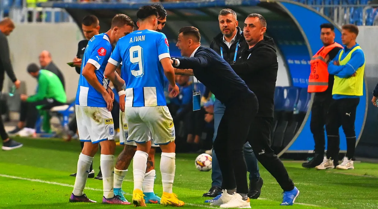 Mirel Radoi si Emil Pieleanu discuta cu fotbalistii craioveni Nicusor Silviu Bancu si Andrei Virgil Ivan la meciul de fotbal dintre Universitatea Craiova si FC Voluntari, contand pentru Superliga Superbet, desfasurat pe Stadionul Ion Oblemenco din Craiova, vineri 30 septembrie 2022. © FOTO:Razvan Pasarica/SPORT PICTURES
