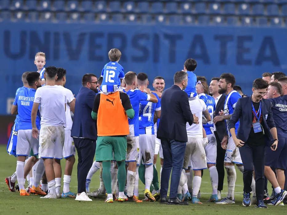 Bucurie craioveana cu Screciu Vladimir Ionut, Mirel Radoi si Paul Papp dupa meciul de fotbal dintre Universitatea Craiova si FC Zorya Luhansk, din cadrul UEFA Europa Conference League, desfasurat pe Stadionul Ion Oblemenco din Craiova, joi 11 august 2022. © FOTO:Razvan Pasarica/SPORT PICTURES