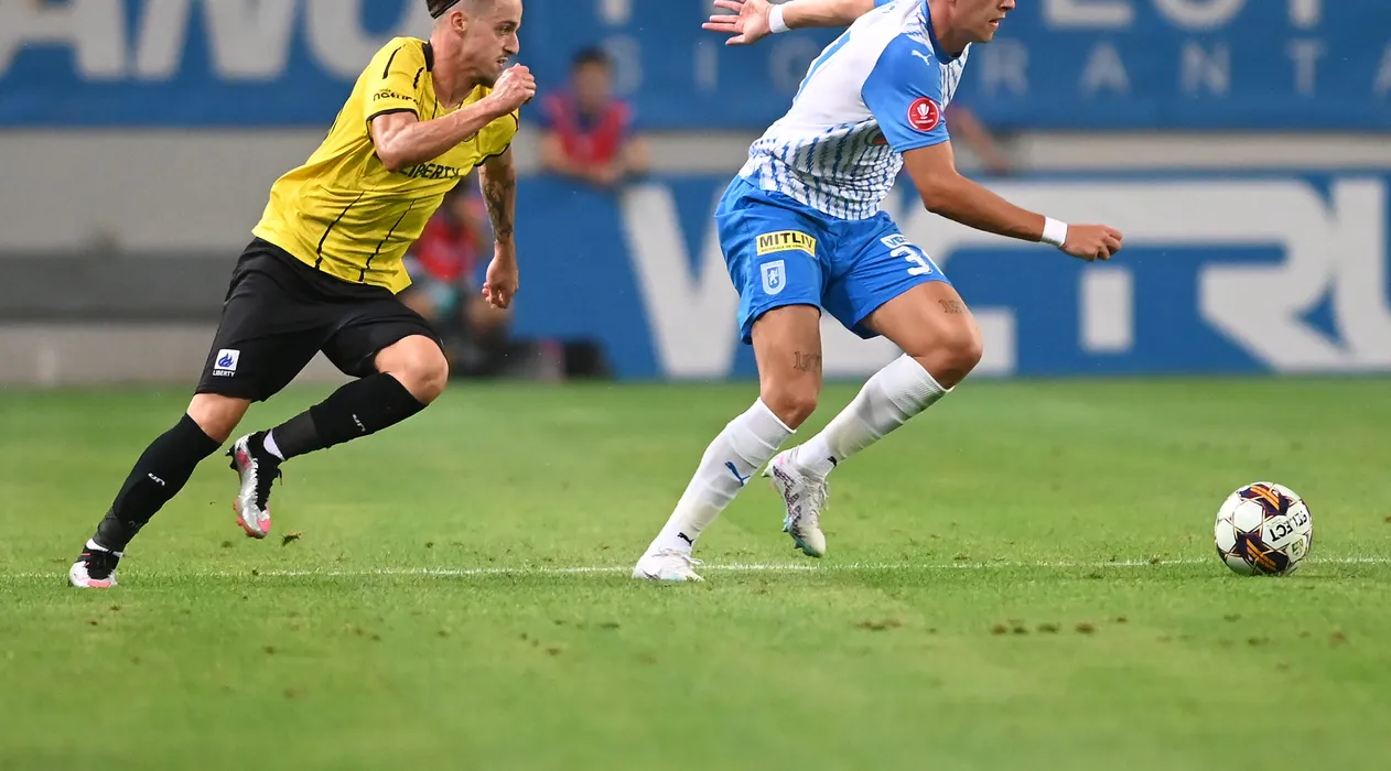 Stefan Bodisteanu si Mihai Alexandru Isfan in meciul de fotbal dintre Universitatea Craiova si Otelul Galati, contand pentru Superliga Superbet, desfasurat pe Stadionul Ion Oblemenco din Craiova, luni 24 iulie 2023. © FOTO:Razvan Pasarica/SPORT PICTURES