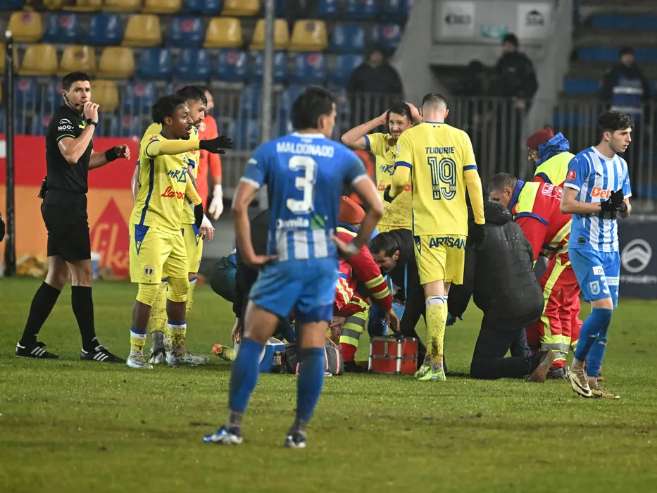 Arbitrul central Marian Barbu, Tidiane Keita, Lucian Mihai Dumitriu si Stefan Daniel Bana reacționează la prabusirea pe teren a lui Yohan Cedric Benjamin Roche in meciul de fotbal dintre Petrolul Ploiesti si Universitatea Craiova, din cadrul Superligii Superbet desfasurat pe Stadionul Ilie Oana din Ploiesti, sambata 7 decembrie 2024. © FOTO:Razvan Pasarica/SPORT PICTURES