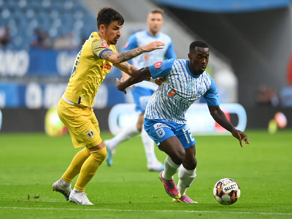 Sergiu Catalin Hanca si Basilio Ndong Owono Nchama in meciul de fotbal dintre Universitatea Craiova si Petrolul Ploiesti, contand pentru Superliga Superbet, desfasurat pe Stadionul Ion Oblemenco din Craiova, duminica 22 octombrie 2023. © FOTO:Razvan Pasarica/SPORT PICTURES