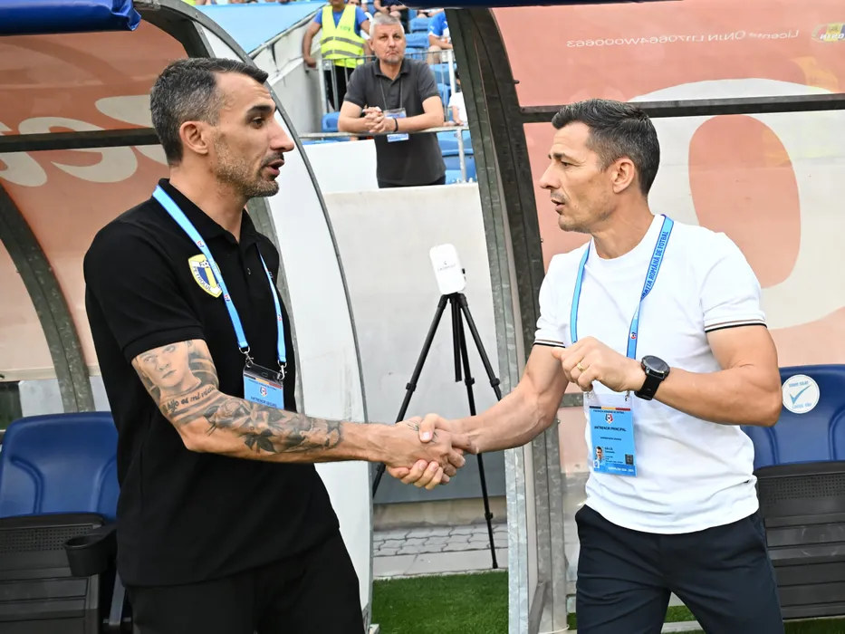 Antrenorii celor doua echipe Constantin Galca si Mehmet Topal se saluta inaintea meciului dintre Universitatea Craiova si Petrolul Ploiesti, contand pentru Superliga Superbet, desfasurat pe Stadionul Ion Oblemenco din Craiova, duminica 4 august 2024. © FOTO:Razvan Pasarica/SPORT PICTURES