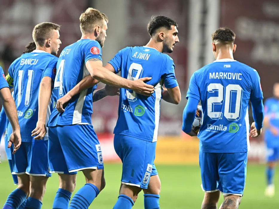 Fotbaliștii craioveni Nicușor Silviu Bancu, Alexandru Crețu si Jovan Markovic îl felicită pe Andrei Virgil Ivan dupa un gol marcat in meciul de fotbal dintre Rapid Bucuresti si Universitatea Craiova, din cadrul Play off-ului Superligii Superbet, desfasurat pe Superbet Arena-Giulesti din Bucuresti, luni 29 aprilie 2024. © FOTO: