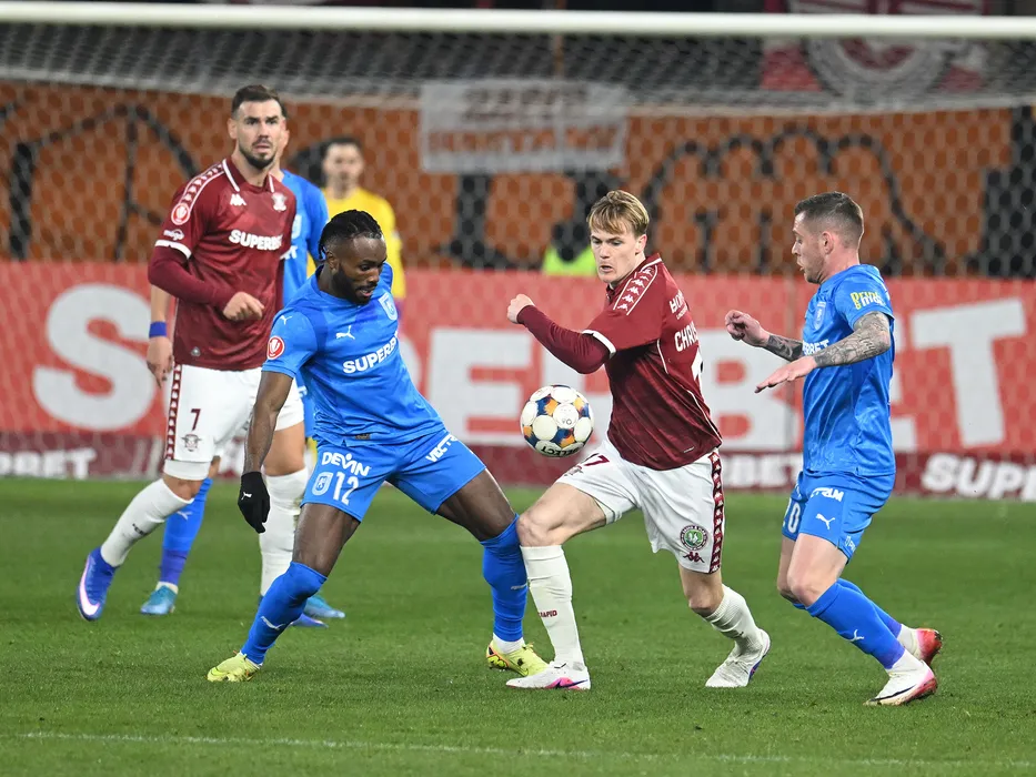 Bassey Etim Monday, Tobias Christensen si Alexandru Cicaldau in meciul de fotbal dintre Rapid Bucuresti si Universitatea Craiova, din cadrul Superligii Superbet, desfasurat pe Superbet Arena-Giulesti din Bucuresti, duminica 8 martie 2026. © FOTO:Razvan Pasarica/SPORT PICTURES
