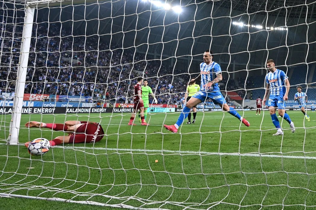 Vasile Mogos marchează un gol în poarta lui Marian Mihai Aioani de langa Sebastian Andrei Borza si Cristian Ignat sub privirile lui Jovo Lukic in meciul dintre Universitatea Craiova si Rapid Bucuresti, contand pentru Play off-ul Superligii Superbet, desfasurat pe Stadionul Ion Oblemenco din Craiova, vineri 2 mai 2025. © FOTO:Razvan Pasarica/SPORT PICTURES