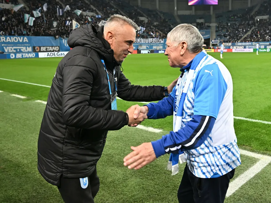 Bogdanov Ivaylo Petev il saluta pe Nicolae Ghita la meciul de fotbal dintre Universitatea Craiova si Rapid Bucuresti, contând pentru Superliga Superbet, desfășurat pe Stadionul Ion Oblemenco din Craiova, luni 4 martie 2024. © FOTO: Răzvan PĂSĂRICĂ/SPORT PICTURES