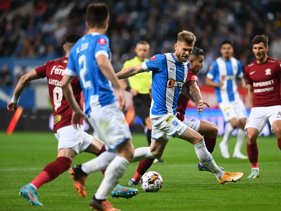 Alexandru Cretu si Morais Junior Iraneuton Sousa in meciul de fotbal dintre Universitatea Craiova si Rapid Bucuresti, contand pentru Play-off-ul Superligii Superbet, desfasurat pe Stadionul Ion Oblemenco din Craiova, duminica 16 aprilie 2023. © FOTO:Razvan Pasarica/SPORT PICTURES