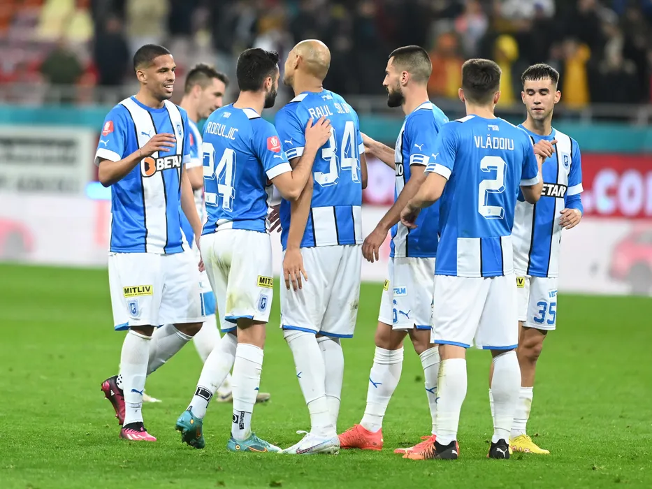 Fotbalistii craioveni Vitor Ferreira Mosac Rivaldo, Gjoko Zajkov si David Sala se felicita dupa meciul de fotbal dintre FCSB si Universitatea Craiova, contand pentru Superliga Superbet, desfasurat pe Arena Nationala din Bucuresti, duminica 19 februarie 2023. © FOTO:Razvan Pasarica/SPORT PICTURES