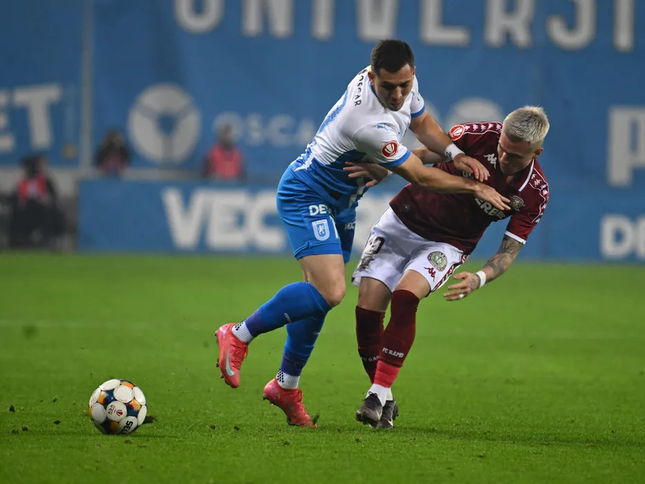 Carlos Andrei Mora Montoya si Claudiu Adrian Mihai Petrila in meciul dintre Universitatea Craiova si Rapid Bucuresti, contand pentru Superliga Superbet, desfasurat pe Stadionul Ion Oblemenco din Craiova, duminica 2 noiembrie 2025. © FOTO:Razvan Pasarica/SPORT PICTURES
