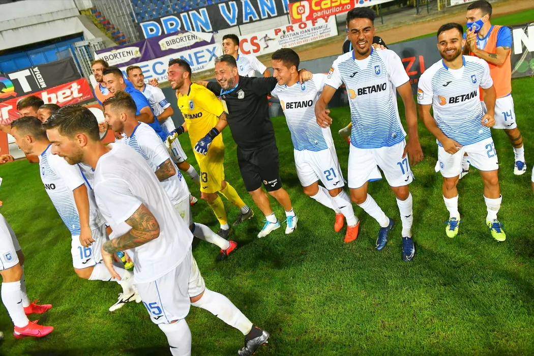 Fotbalistii Craiovei Alexandru Cicaldau, Mirko Pigliacelli,Antoni Ivanov, Stefan Baiaram si Cristian Barbut se bucura dupa victoria din meciul de fotbal dintre FC Botosani si Universitatea Craiova, contand pentru play-off-ul Ligii 1 Casa Pariurilor, disputat fara spectatori pe Stadionul Municipal din Botosani, duminica 19 iulie 2020. © FOTO:Razvan Pasarica/SPORT PICTURES