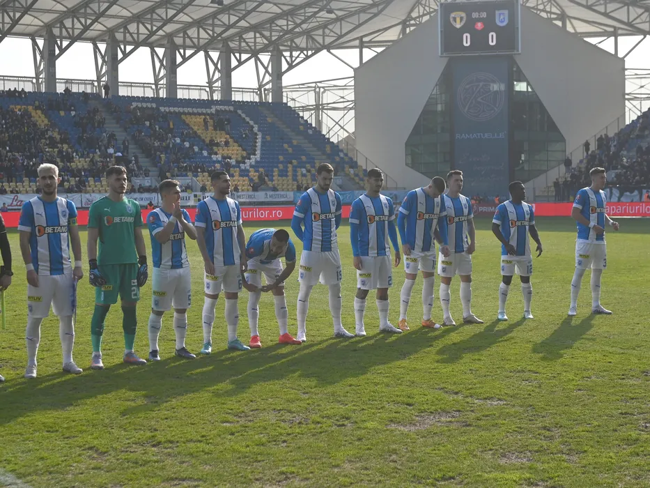 Fotbalistii craioveni la startul meciului de fotbal dintre Petrolul Ploiesti si Universitatea Craiova, contand pentru Superliga Superbet, desfasurat pe Stadionul Ilie Oana din Ploiesti, duminica 5 martie 2023. © FOTO:Razvan Pasarica/SPORT PICTURES