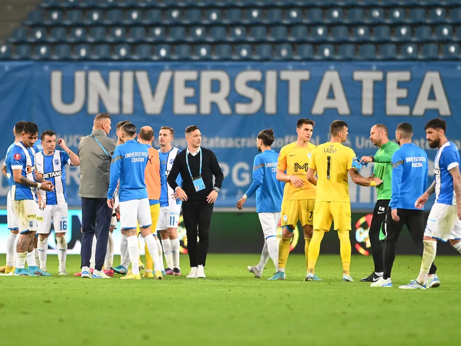 Mirel Radoi alaturi de fotbalistii craioveni Jovan Markovic, Dan Nicolae Nistor, Nicusor Silviu Bancu, David Beniamin Lazar si voluntareanul Mihai Maximilian Popa dupa meciul de fotbal dintre Universitatea Craiova si FC Voluntari, contand pentru Superliga Superbet, desfasurat pe Stadionul Ion Oblemenco din Craiova, vineri 30 septembrie 2022. © FOTO:Razvan Pasarica/SPORT PICTURES