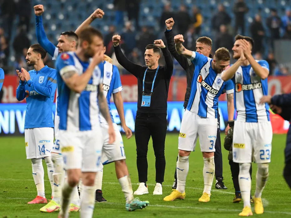 Mirel Radoi alaturi de fotbalistii craioveni printre care Eduard Marian Floresu saluta galeria dupa meciul de fotbal dintre Universitatea Craiova si Universitatea Cluj, contand pentru Superliga Superbet, desfasurat pe Stadionul Ion Oblemenco din Craiova, sambata 5 noiembrie 2022. © FOTO:Razvan Pasarica/SPORT PICTURES