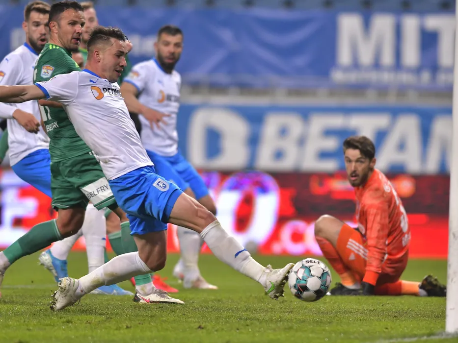 Alexandru Mateiu marcheaza un gol anulat de langa Adnan Aganovic in meciul de fotbal dintre Universitatea Craiova si Sepsi OSK Sfantu Gheorghe, contand pentru Play-off-ul Ligii 1 Casa Pariurilor, desfasurat fara spectatori pe Stadionul Ion Oblemenco din Craiova, sambata 17 aprilie 2021. © FOTO:Razvan Pasarica/SPORT PICTURES
