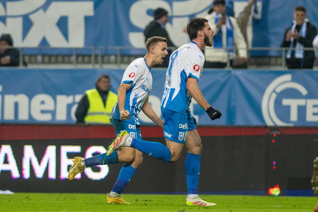 Nicusor Silviu Bancu si Tudor Cristian Baluta se bucura dupa un gol marcat in meciul de fotbal dintre Universitatea Craiova si FC CFR 1907 Cluj, contand pentru Superliga Superbet, desfasurat pe Stadionul Ion Oblemenco din Craiova, duminica 7 decembrie 2025. © FOTO:Raed Krishan/SPORT PICTURES