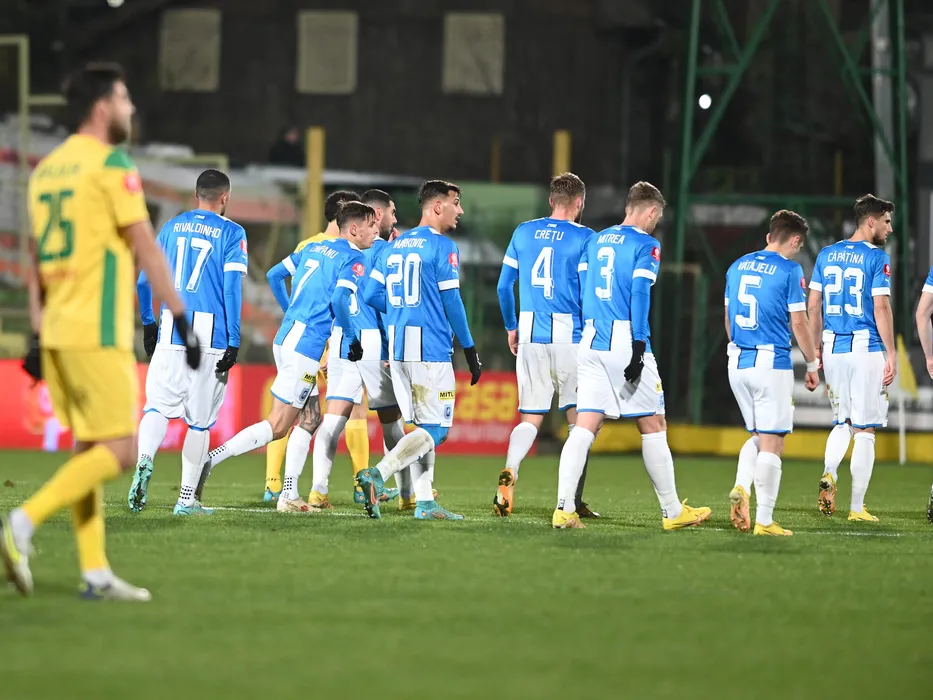 Bucurie a fotbalistilor craioveni dupa un gol marcat cu Alexandru George Cimpanu, Jovan Markovic si Cristian Mihai Capatina in meciul de fotbal dintre CS Mioveni si Universitatea Craiova, contand pentru Superliga Superbet, desfasurat pe Stadionul Orasenesc din Mioveni, luni 12 decembrie 2022. © FOTO:Razvan Pasarica/SPORT PICTURES