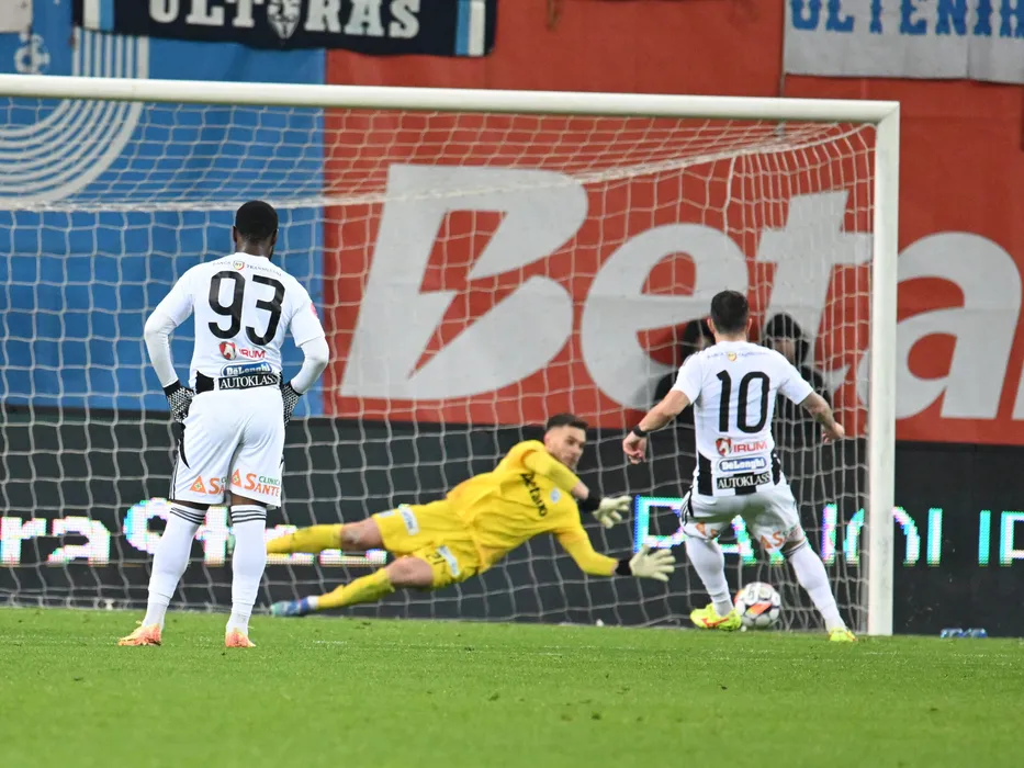 Iulian Laurențiu Popescu apara un penalty executat de catre Dan Nicolae Nistor in meciul dintre Universitatea Craiova si Universitatea Cluj, contand pentru Superliga Superbet, desfasurat pe Stadionul Ion Oblemenco din Craiova, miercuri 5 februarie 2025. © FOTO:Razvan Pasarica/SPORT PICTURES