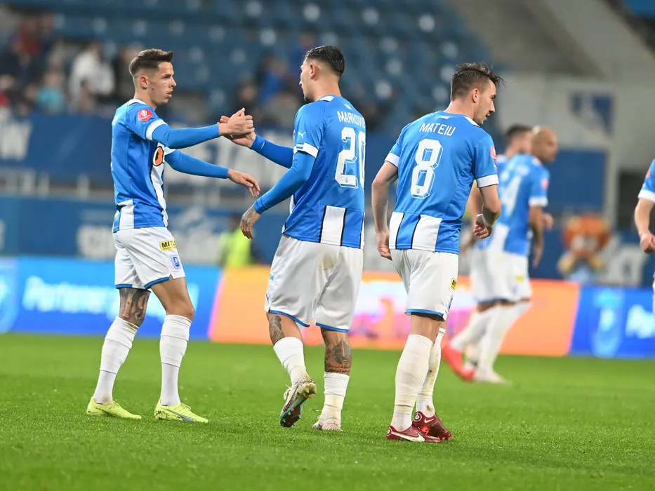 Jovan Markovic se bucura dupa un gol marcat alaturi de Alexandru George Cimpanu si Alexandru Mateiu in meciul de fotbal dintre Universitatea Craiova si UTA Arad, contand pentru Superliga Superbet, desfasurat pe Stadionul Ion Oblemenco din Craiova, vineri 10 martie 2023. © FOTO:Razvan Pasarica/SPORT PICTURES