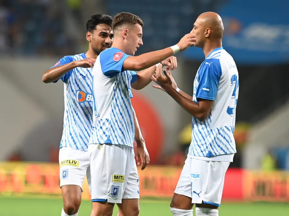 Bucurie a fotbalistilor craioveni dupa un gol marcat cu Stefan Baiaram, Mihai Alexandru Isfan si Raul Michel Melo Da Silva in meciul de fotbal dintre Universitatea Craiova si UTA Arad, contand pentru Superliga Superbet, desfasurat pe Stadionul Ion Oblemenco din Craiova, vineri 18 august 2023. © FOTO:Razvan Pasarica/SPORT PICTURES