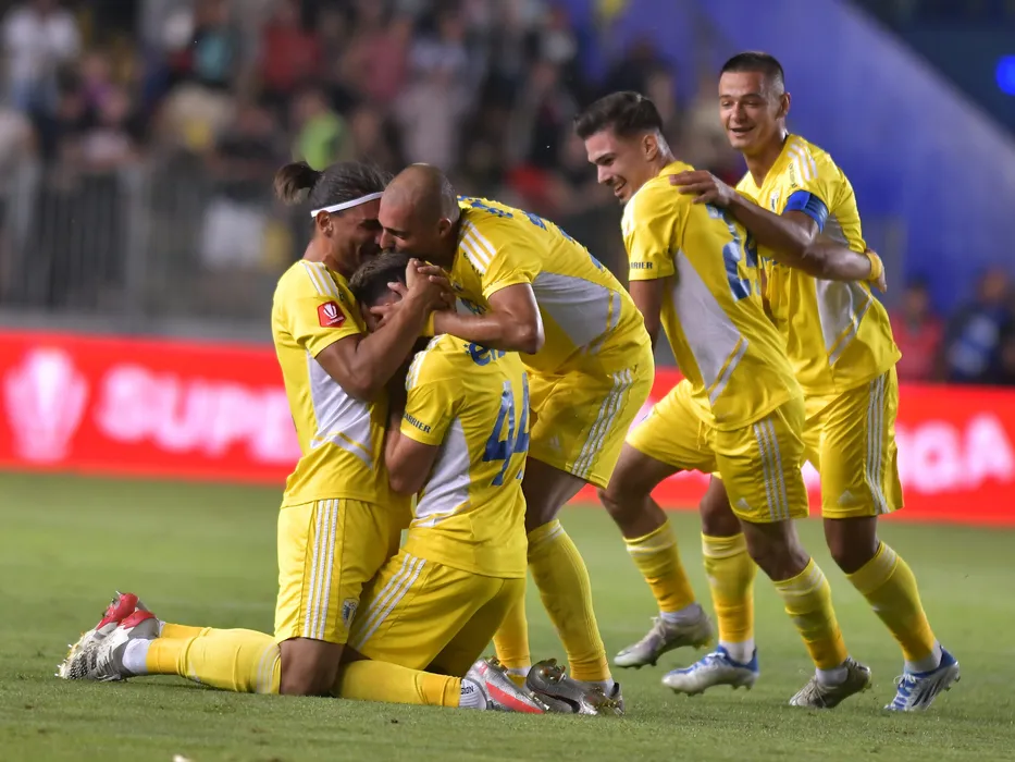 Lucian Mihai Dumitriu se bucura alaturi de Gabriel Sebastian Tamas, Valentin Constantin Ticu, Marius Cioiu si Marian Fernando Huja dupa un gol anulat in meciul de fotbal dintre Petrolul Ploiesti si FC Voluntari, contand pentru Superliga Superbet, desfasurat pe Stadionul Ilie Oana din Ploiesti, luni 18 iulie 2022. © FOTO:Razvan Pasarica/SPORT PICTURES