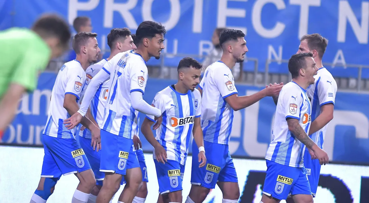 Bucurie a fotbalistilor craioveni dupa un gol marcat cu Nicusor Silviu Bancu, Alexandru George Cimpanu, Lyes Hafid Houri, Andrei Virgil Ivan si Mihai Alexandru Balasa in meciul de fotbal dintre Universitatea Craiova si Academica Clinceni, contand pentru Liga 1 Casa Pariurilor, desfasurat pe Stadionul Ion Oblemenco din Craiova, luni 18 octombrie 2021. © FOTO:Razvan Pasarica/SPORT PICTURES