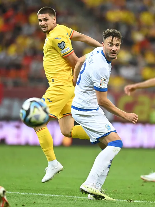 Răzvan Marin si Amir Rrahmani in meciul de fotbal dintre Romania si Kosovo, din cadrul preliminariilor Campionatului European 2024, desfasurat pe Arena Nationala, marti 12 septembrie 2023. © FOTO:Razvan Pasarica/SPORT PICTURES