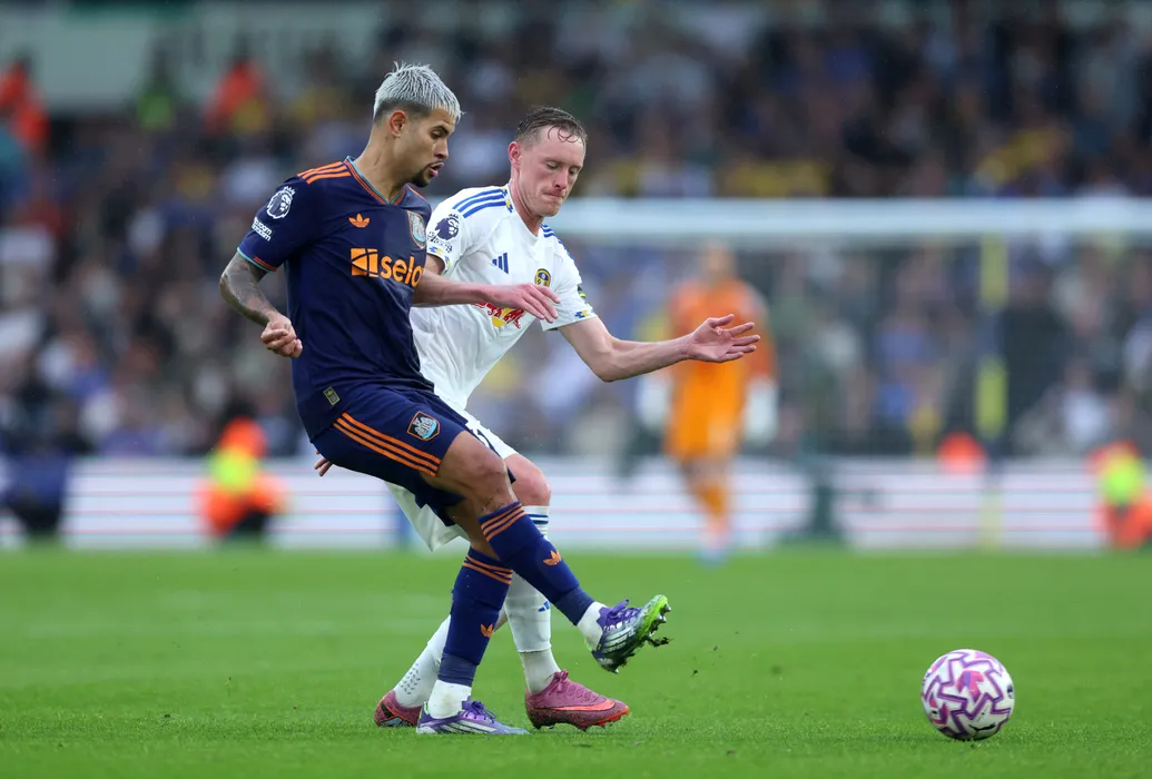 30 August 2025, United Kingdom, Leeds: Newcastle United's Bruno Guimaraes (L) and Leeds United's Sean Longstaff battle for the ball during the English Premier League soccer match between Leeds United and Newcastle United at Elland Road. Photo: Nigel French/PA Wire/dpa