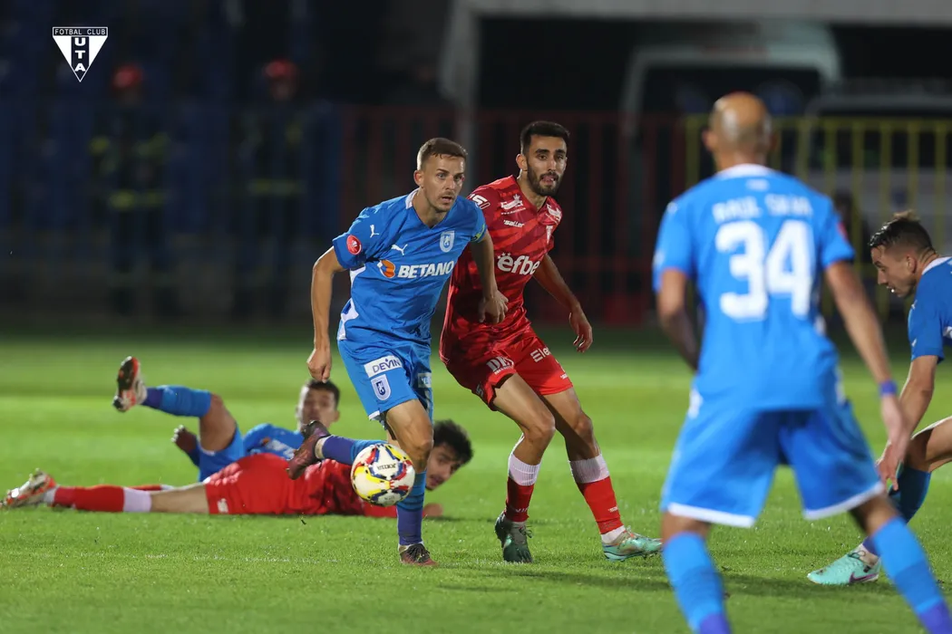 Nicușor Silviu Bancu și Diogo Miguel Costa Rodrigues în meciul de fotbal dintre UTA ARAD si UNIVERSITATEA CRAIOVA, contând pentru CUPA ROMÂNIEI BETANO, desfășurat pe Stadionul "Iuliu Bodola" din Oradea, miercuri 01 noiembrie 2023. © FOTO:Ciprian PETCUT/SPORT PICTURES