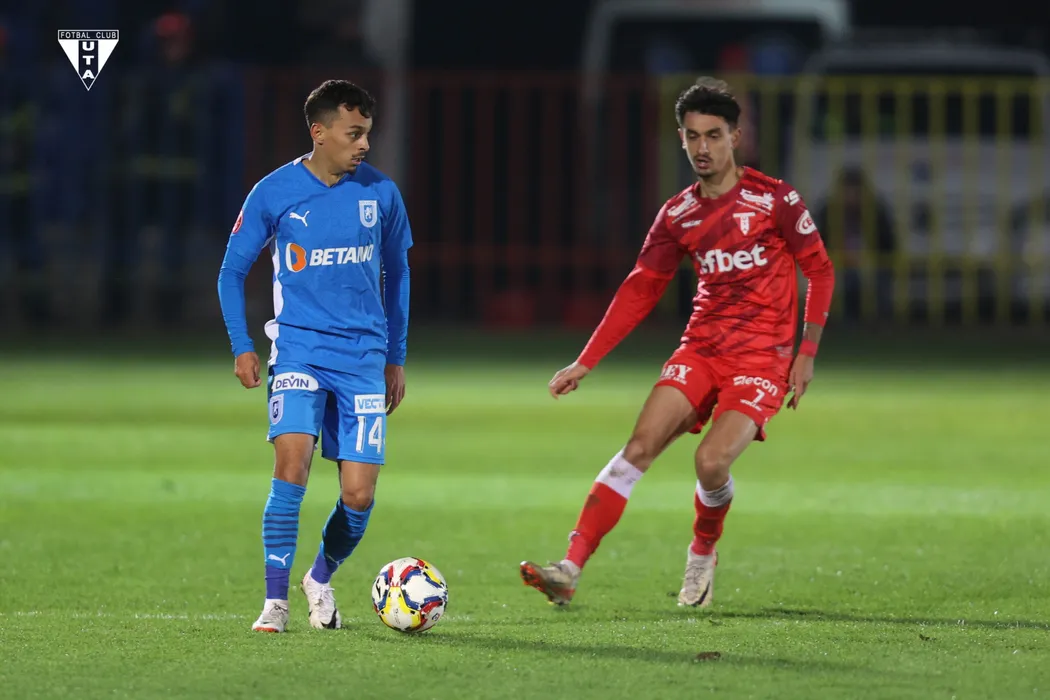 Lyes Hafid Houri și Albert Tivadar Stahl în meciul de fotbal dintre UTA ARAD si UNIVERSITATEA CRAIOVA, contând pentru CUPA ROMÂNIEI BETANO, desfășurat pe Stadionul "Iuliu Bodola" din Oradea, miercuri 01 noiembrie 2023. © FOTO:Ciprian PETCUT/SPORT PICTURES