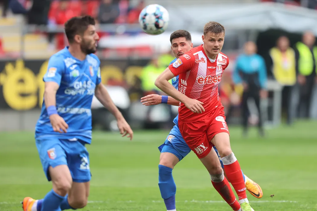 Laukzemis Karolis (D), de la UTA Arad, suteaza in timpul meciului de fotbal contra echipei Chindia Tragoviste din etapa a 6-a a play-out-ului Ligii 1, disputat pe Arena Francisc Neuman din Arad, sambata, 23 aprilie 2022. CIPRIAN PETCUT / MEDIAFAX FOTO