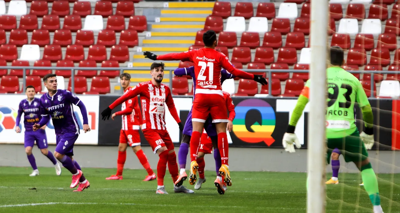 Cristian Cosmin Dumitru si Alexandru Cristian Albu in meciul de fotbal dintre UTA Arad si FC Arges, contand pentru Liga 1 Casa Pariurilor, desfasurat fara spectatori pe Stadionul Francisc Neuman din Arad, sambata 23 ianuarie 2021. © FOTO:Ciprian Petcut/SPORT PICTURES