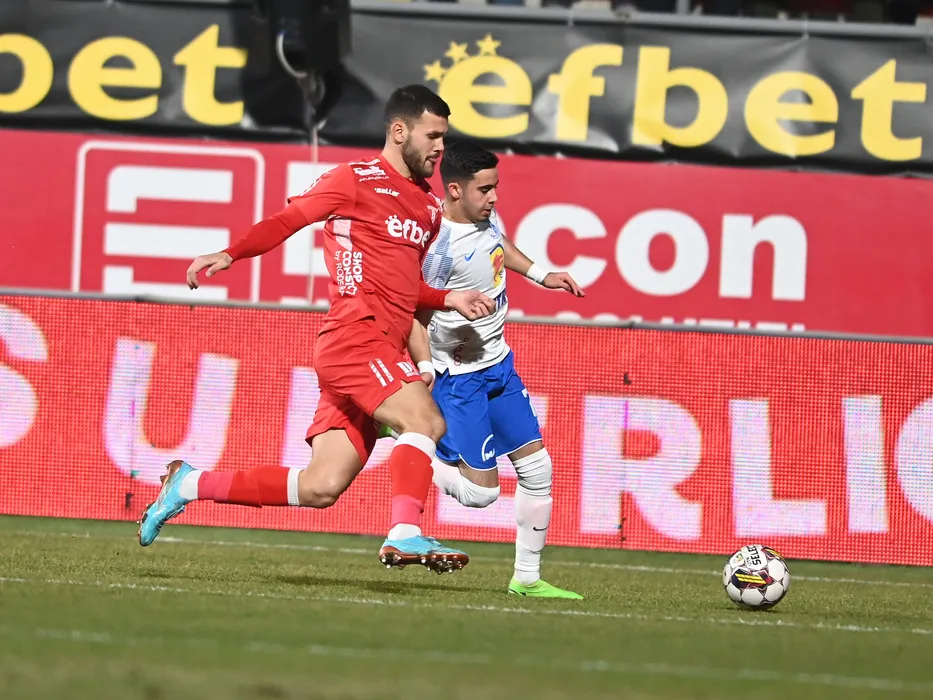 Andrei Chindris si Enes Sali in meciul de fotbal dintre UTA Arad si Farul Constanta, contand pentru Superliga Superbet, desfasurat pe Arena Francisc Neuman din Arad, vineri 24 februarie 2023. © FOTO:Razvan Pasarica/SPORT PICTURES