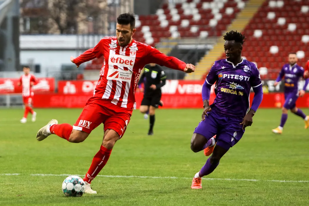 Alexandru Constantin Benga si Mediop Ndiaye in meciul de fotbal dintre UTA Arad si FC Arges, contand pentru Liga 1 Casa Pariurilor, desfasurat fara spectatori pe Stadionul Francisc Neuman din Arad, sambata 23 ianuarie 2021. © FOTO:Ciprian Petcut/SPORT PICTURES