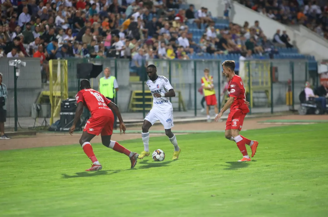 N'Goma incadrat de Abeid si Micovschi in meciul de fotbal dintre FC BOTOSANI si UTA ARAD, contand pentru Superliga Superbet, desfasurat pe Stadionul Municipal din Botosani, sambata 23 septembrie 2023. © FOTO: Ionut Tabultoc/SPORT PICTURES