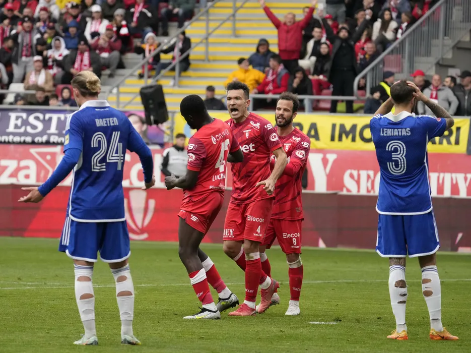 Alexandru Constantin Benga și Joao Pedro Almeida Machado se bucură pentru lovitura de la 11m obținută de Kevin Luckassen după consultarea VAR în meciul de fotbal dintre UTA Arad si FCU 1948 Craiova, contând pentru Superliga Superbet, desfășurat pe Arena Francisc Neuman din Arad, sâmbătă 2 martie 2024. © FOTO: Alexandra FECHETE/SPORT PICTURES