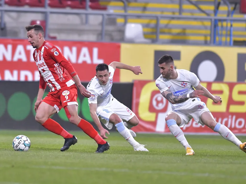 Olimpiu Vasile Morutan, Roger Junio Rodrigues Figueira si Ovidiu Marian Popescu in meciul de fotbal dintre UTA Arad si FCSB, contand pentru Liga 1 Casa Pariurilor, desfasurat fara spectatori pe Stadionul Francisc von Neuman din Arad, sambata 13 martie 2021. © FOTO:Razvan Pasarica/SPORT PICTURES