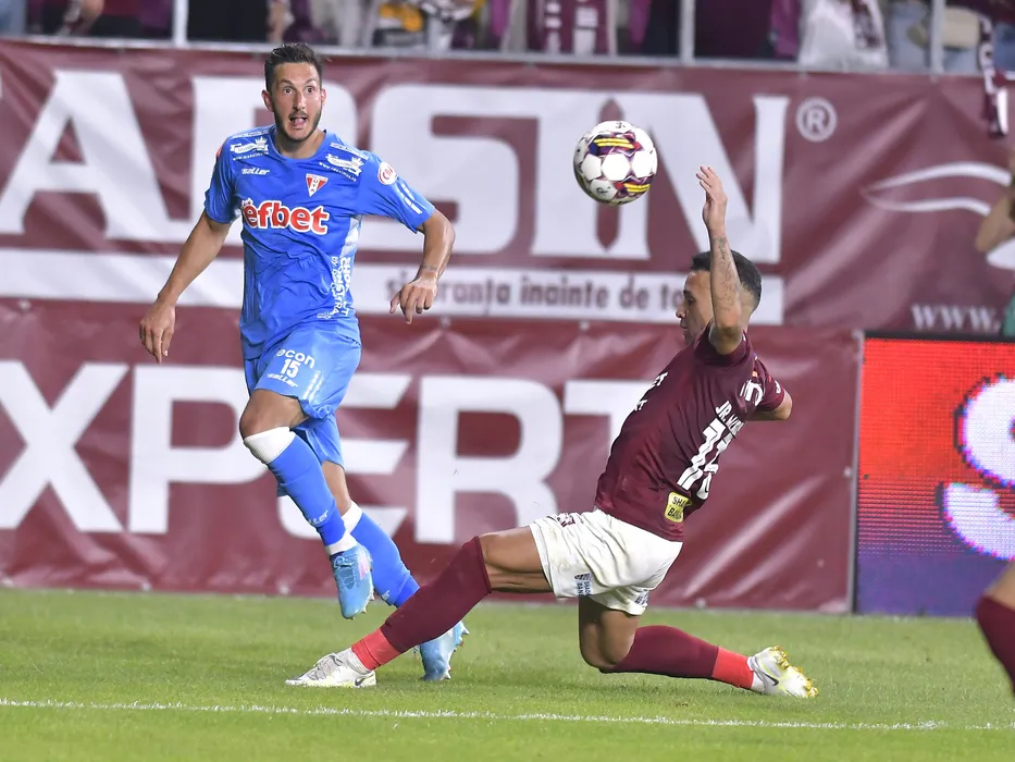 Marko Vukcevic si Morais Junior Iraneuton Sousa in meciul de fotbal dintre Rapid Bucuresti si UTA Arad, contand pentru Superliga Superbet, desfasurat pe Stadionul Rapid Giulesti din Bucuresti, sambata 20 august 2022. © FOTO:Razvan Pasarica/SPORT PICTURES