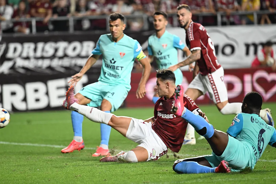 Mihai Alexandru Dobre marchează un gol de lângă Alexandru Constantin Benga si Florent Gregoire Paulolo in meciul de fotbal dintre Rapid Bucuresti si UTA Arad, din cadrul Superligii Superbet, desfasurat pe Superbet Arena-Giulesti din Bucuresti, vineri 29 august 2025. © FOTO:Razvan Pasarica/SPORT PICTURES